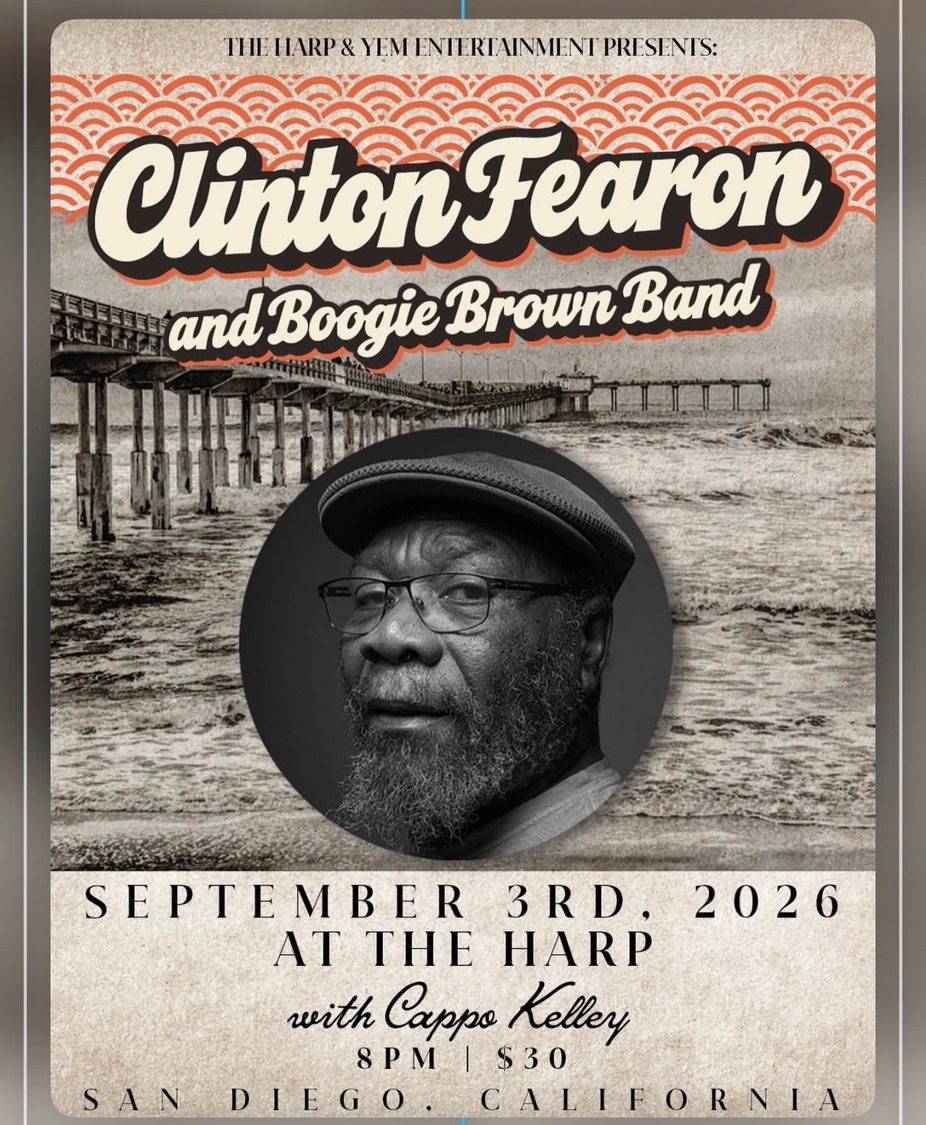 ADA Description: Concert poster featuring Clinton Fearon and Boogie Brown Band. The design includes a vintage-style background of an ocean pier with waves. A black-and-white portrait of Clinton Fearon wearing glasses and a cap is centered in the image. Text reads: “The Harp & YEM Entertainment Presents: Clinton Fearon and Boogie Brown Band.” Event details listed: September 3rd, 2026 at The Harp, with Capo Kelley, 8 PM, $30, San Diego, California. The poster uses a retro aesthetic with warm tones and bold stylized lettering.