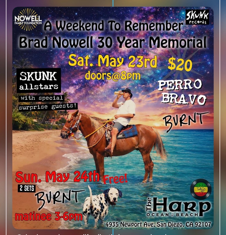 A weekend to remember Brad Nowell- Skunk Records its only fitting that we bring the memorial madness to our second home, San Diego here we come! Saturday is a night show and Sunday is a matinee with @burntband playing two sets and all requests ! Can’t think of a better town and venue to kick off a historic weekend in honor of Brad, Papa Jim and Loudog!!