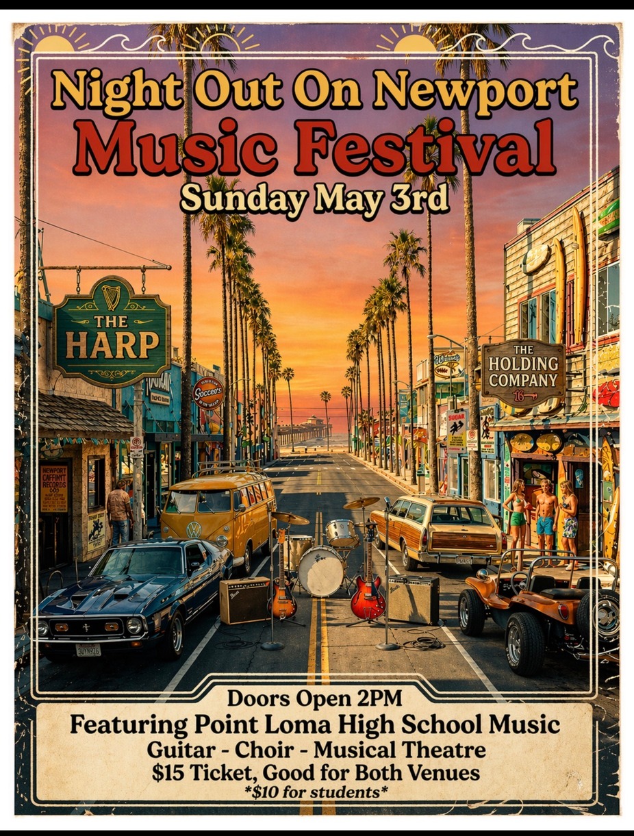 Night Out on Newport Music Festival 🎶 📅 Sunday, May 3rd 🕑 Event starts at 2:00 PM 📍 The Harp & The Holding Company – Ocean Beach, San Diego